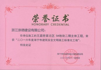 王庭世家2016年度標準化工地榮譽證書